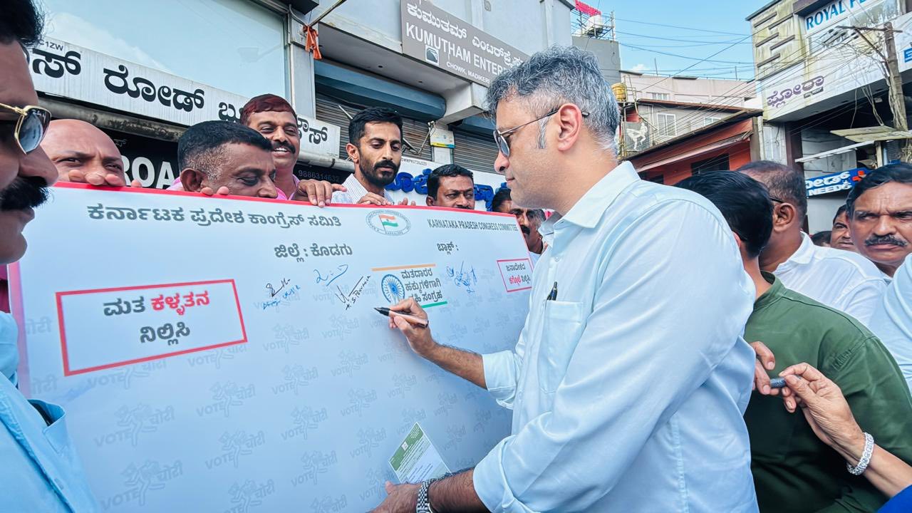 ಮಡಿಕೇರಿಯ ಜಿಲ್ಲಾ ಕಾಂಗ್ರೆಸ್ ಕಚೇರಿಯಲ್ಲಿ ಹಮ್ಮಿಕೊಂಡ 'ಮತ ಕಳ್ಳತನ ನಿಲ್ಲಿಸಿ' ಸಹಿ ಅಭಿಯಾನದ ಕುರಿತ ಕಾರ್ಯಕ್ರಮದಲ್ಲಿ ಭಾಗವಹಿಸಿದ್ದ ಸಂದರ್ಭ.