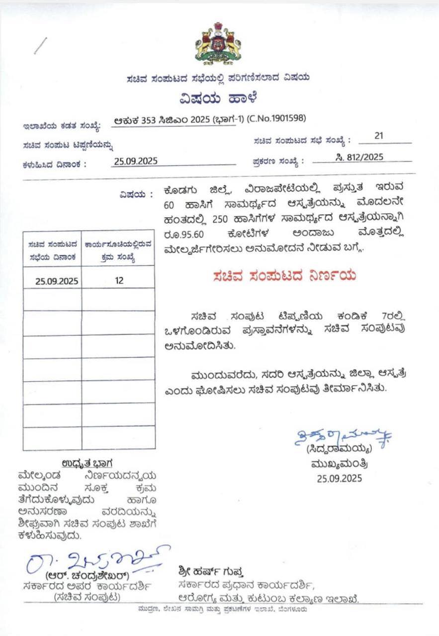The first phase of approval given by the government to upgrade Virajpet Taluk Hospital as a 400 bed hospital, 250 bed upper grade work at a cost of ₹ 95.6 crore will start soon. Heartfelt thanks to the Honorable Chief Minister who gave approval in the cab, 04/10/2025