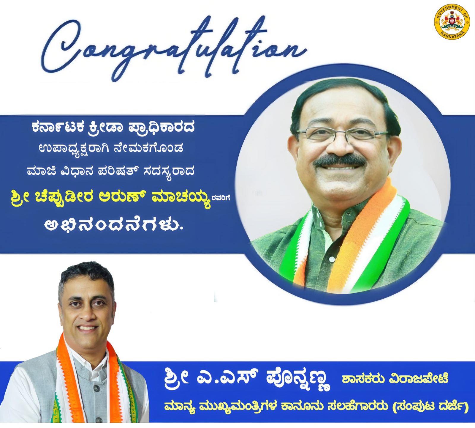 ಕರ್ನಾಟಕ ಕ್ರೀಡಾ ಪ್ರಾಧಿಕಾರದ ಉಪಾಧ್ಯಕ್ಷರಾಗಿ ನೇಮಕಗೊಂಡ ಮಾಜಿ ವಿಧಾನ ಪರಿಷತ್ ಸದಸ್ಯರಾದ ಶ್ರೀ ಚೆಪ್ಪುಡೀರ ಅರುಣ್ ಮಾಚಯ್ಯ ರವರಿಗೆ ಅಭಿನಂದನೆಗಳು.