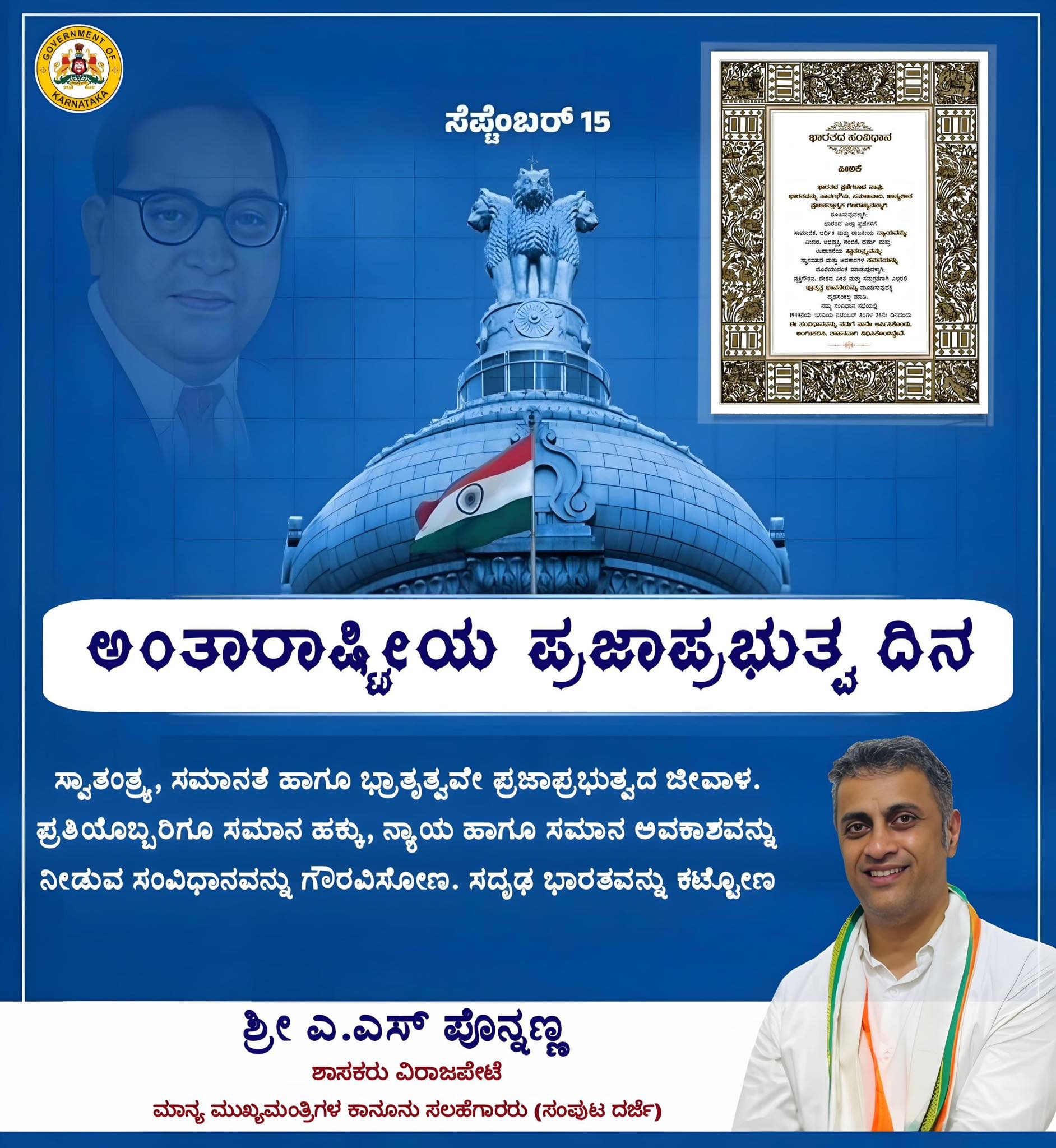 ಅಂತಾರಾಷ್ಟ್ರೀಯ ಪ್ರಜಾಪ್ರಭುತ್ವ ದಿನ ಸ್ವಾತಂತ್ರ್ಯ, ಸಮಾನತೆ ಹಾಗೂ ಭ್ರಾತೃತ್ವವೇ ಪ್ರಜಾಪ್ರಭುತ್ವದ ಜೀವಾಳ. ಪ್ರತಿಯೊಬ್ಬರಿಗೂ ಸಮಾನ ಹಕ್ಕು, ನ್ಯಾಯ ಹಾಗೂ ಸಮಾನ ಅವಕಾಶವನ್ನು ನೀಡುವ ಸಂವಿಧಾನವನ್ನು ಗೌರವಿಸೋಣ. ಸದೃಢ ಭಾರತವನ್ನು ಕಟ್ಟೋಣ..