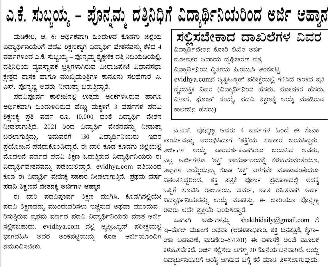 Scholarship for Girls students of Kodagu, 14/08/2025
