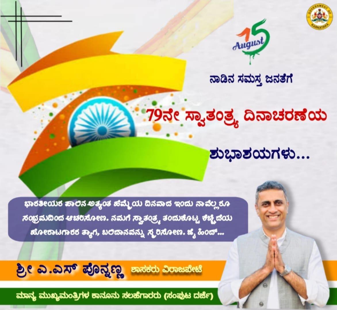 ನಾಡಿನ ಸಮಸ್ತ ಜನತೆಗೆ 79ನೇ ಸ್ವಾತಂತ್ರ್ಯ ದಿನಾಚರಣೆಯ ಶುಭಾಶಯಗಳು. ಭಾರತೀಯರ ಪಾಲಿನ ಅತ್ಯಂತ ಹೆಮ್ಮೆಯ ದಿನವಾದ ಇಂದು ನಾವೆಲ್ಲ ರೂ ಸಂಭ್ರಮದಿಂದ ಆಚರಿಸೋಣ. ನಮಗೆ ಸ್ವಾತಂತ್ರ್ಯ ತಂದುಕೊಟ್ಟ ಕೆಚ್ಚೆದೆಯ ಹೋರಾಟಗಾರರ ತ್ಯಾಗ, ಬಲಿದಾನವನ್ನು ಸ್ಮರಿಸೋಣ. ಜೈ ಹಿಂದ್ .../div>