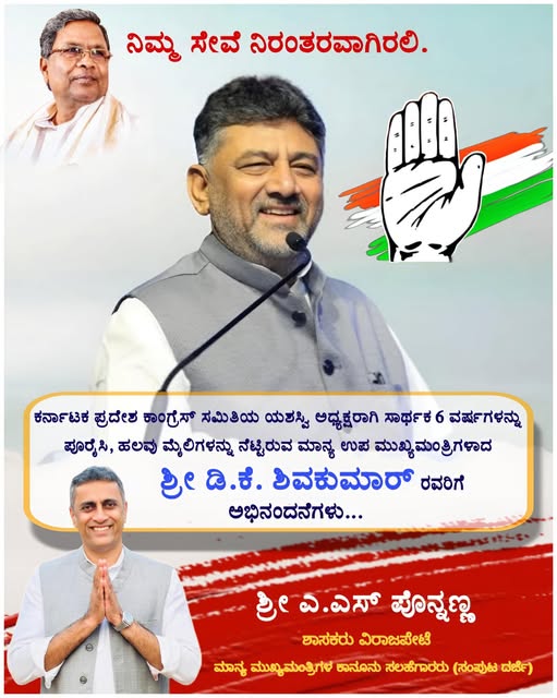 ಕರ್ನಾಟಕ ಪ್ರದೇಶ ಕಾಂಗ್ರೆಸ್ ಸಮಿತಿಯ ಯಶಸ್ವಿ ಅಧ್ಯಕ್ಷರಾಗಿ ಸಾರ್ಥಕ 6 ವರ್ಷಗಳನ್ನು ಪೂರೈಸಿ, ಹಲವು ಮೈಲಿಗಳನ್ನು ನೆಟ್ಟಿರುವ ಮಾನ್ಯ ಉಪ ಮುಖ್ಯಮಂತ್ರಿಗಳಾದ ಶ್ರೀ ಡಿ.ಕೆ. ಶಿವಕುಮಾರ್ ರವರಿಗೆ ಅಭಿನಂದನೆಗಳು...