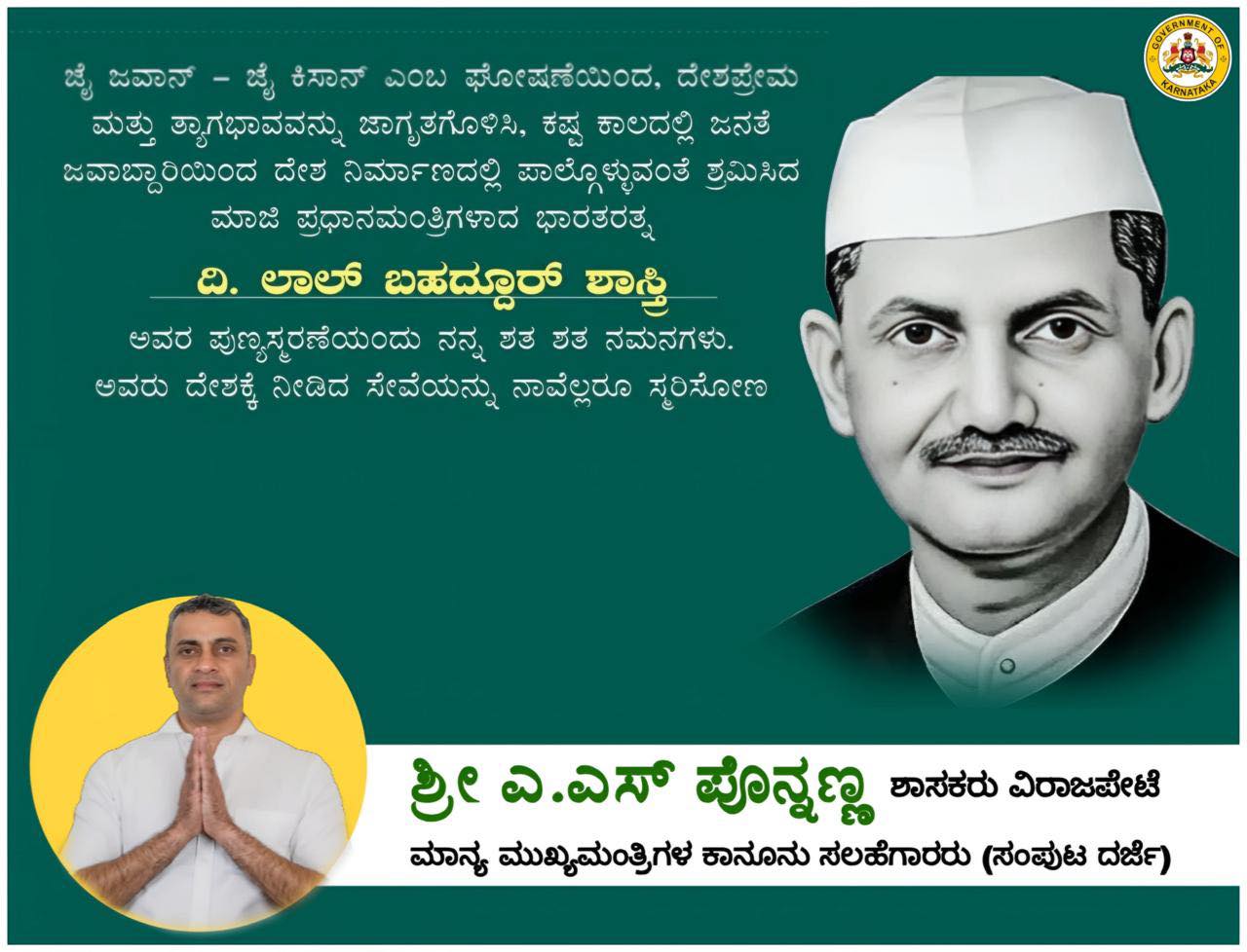 ದಿ. ಲಾಲ್ ಬಹದ್ದೂರ್ ಶಾಸ್ತ್ರಿ ಅವರ ಪುಣ್ಯಸ್ಮರಣೆಯಂದು ನನ್ನ ಶತ ಶತ ನಮನಗಳು.