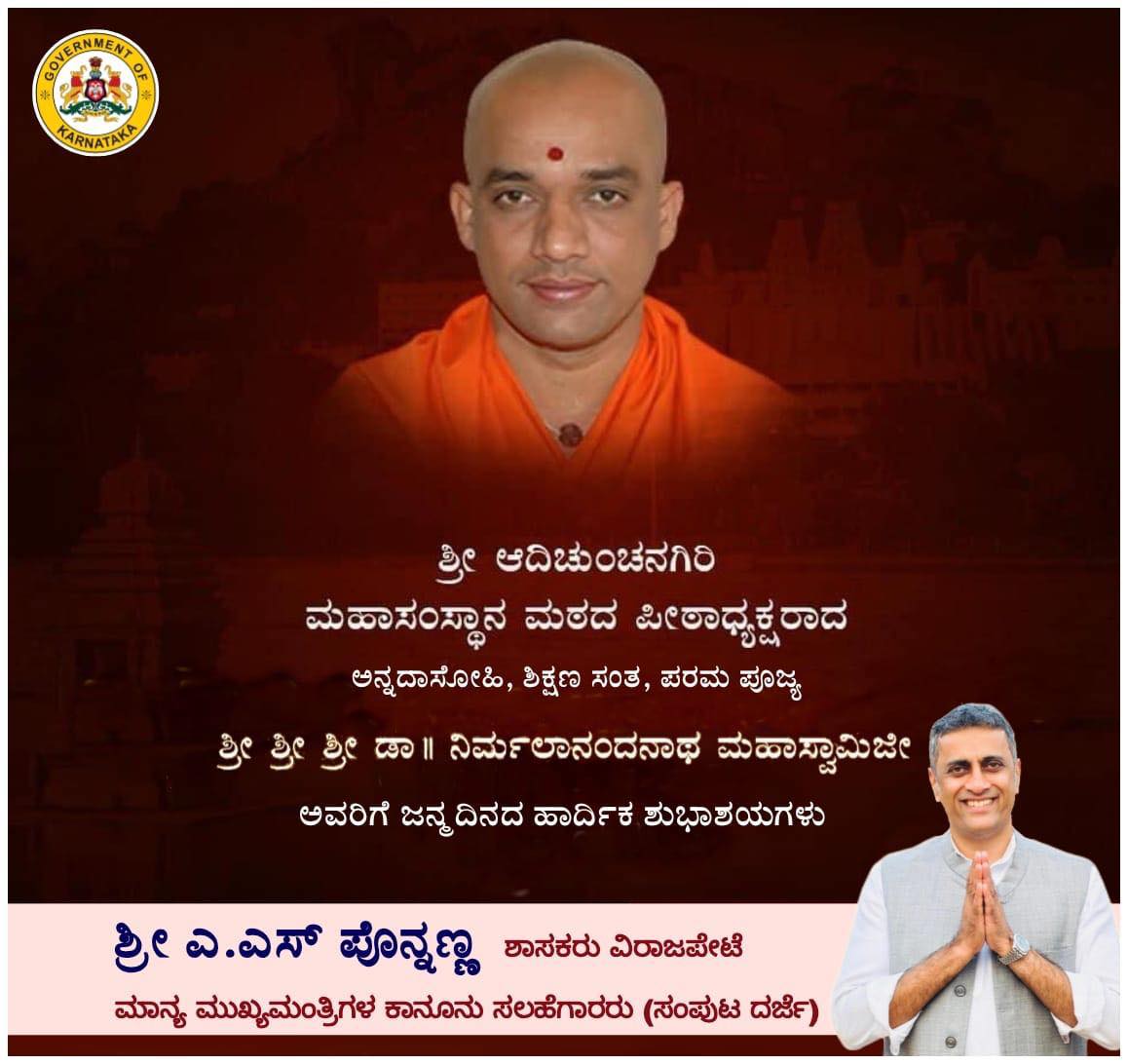 ಶ್ರೀ ಆದಿಚುಂಚನಗಿರಿ ಮಹಾಸಂಸ್ಥಾನ ಮಠದ ಪೀಠಾಧ್ಯಕ್ಷರಾದ ಅನ್ನದಾಸೋಹಿ, ಶಿಕ್ಷಣ ಸಂತ, ಪರಮ ಪೂಜ್ಯ ಶ್ರೀ ಶ್ರೀ ಶ್ರೀ ಡಾ॥ ನಿರ್ಮಲಾನಂದನಾಥ ಮಹಾಸ್ವಾಮಿಜೀ ಅವರಿಗೆ ಜನ್ಮದಿನದ ಹಾರ್ದಿಕ ಶುಭಾಶಯಗಳು