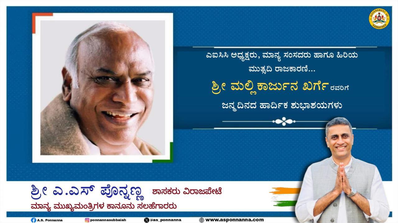 ಎಐಸಿಸಿ ಅಧ್ಯಕ್ಷರು, ಮಾನ್ಯ ಸಂಸದರು ಹಾಗೂ ಹಿರಿಯ ಮುತ್ಸದಿ ರಾಜಕಾರಣಿ ಶ್ರೀ ಮಲ್ಲಿಕಾರ್ಜುನ ಖರ್ಗೆ ರವರಿಗೆ ಜನ್ಮದಿನದ ಹಾರ್ದಿಕ ಶುಭಾಶಯಗಳು
