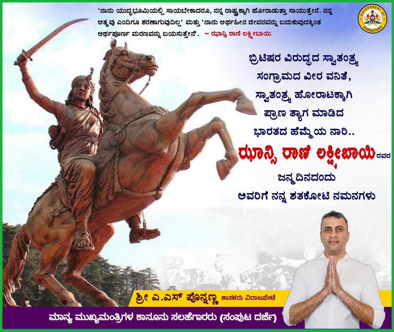 ಬ್ರಿಟಿಷರ ವಿರುದ್ಧದ ಸ್ವಾತಂತ್ರ್ಯ ಸಂಗ್ರಾಮದ ವೀರ ವನಿತೆ, ಸ್ವಾತಂತ್ರ್ಯ ಹೋರಾಟಕ್ಕಾಗಿ ಪ್ರಾಣ ತ್ಯಾಗ ಮಾಡಿದ ಭಾರತದ ಹೆಮ್ಮೆಯ ನಾರಿ ಝಾನ್ಸಿ ರಾಣಿ ಲಕ್ಷ್ಮೀಬಾಯಿ ಅವರ ಜನ್ಮದಿನದಂದು ಅವರಿಗೆ ನನ್ನ ಶತಕೋಟಿ ನಮನಗಳು.