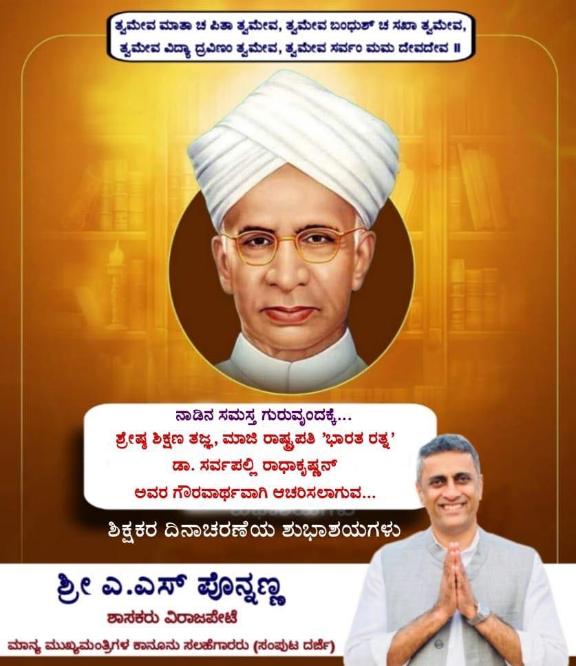 ನಾಡಿನ ಸಮಸ್ತ ಗುರುವೃಂದಕ್ಕೆ ಶ್ರೇಷ್ಠ ಶಿಕ್ಷಣ ತಜ್ಞ, ಮಾಜಿ ರಾಷ್ಟ್ರಪತಿ 'ಭಾರತ ರತ್ನ' ಡಾ. ಸರ್ವಪಲ್ಲಿ ರಾಧಾಕೃಷ್ಣನ್ ಅವರ ಗೌರವಾರ್ಥವಾಗಿ ಆಚರಿಸಲಾಗುವ ಶಿಕ್ಷಕರ ದಿನಾಚರಣೆಯ ಶುಭಾಶಯಗಳು.